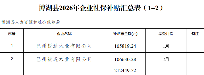 4月8日将博湖县2026年1-2月享受企业社保补贴名单进行公示,符合企业社保补贴发放条件的共1家,申请补贴资金212449.52元。