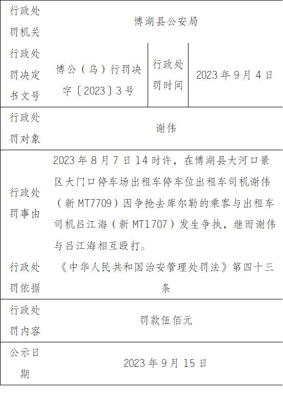 行政处罚信息公示表 博公(乌)行罚决字[2023]3号