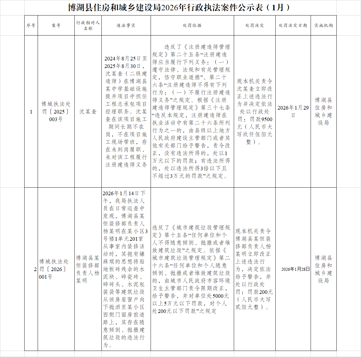 博湖县住房和城乡建设局2026年行政执法案件公示表(1月)