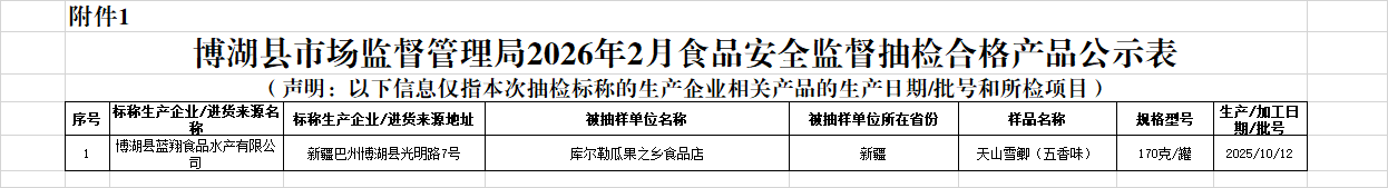 附件1:博湖县市场监督管理局2026年2月食品安全监督抽检合格产品公示表