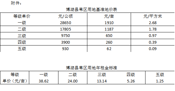 为进一步加强我县苇区用地管理工作,规范收费行为,根据《中华人民共和国土地管理法》等法律法规,经县人民政府研究决定,现将博湖县苇区用地基准地价和年租金标准予以公布。最新博湖县苇区用地基准地价和年租金执行标准自2021年度起实施,此前执行的博湖县苇区用地基准地价和年租金执行标准自2020年12月31日起停止使用。请认真贯彻执行。