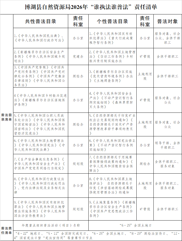 博湖县自然资源局按照我县、州各级的普法工作要求,落实普法责任制,履行普法职责,认真做好各项普法宣传教育工作,现将相关情况总结如下: