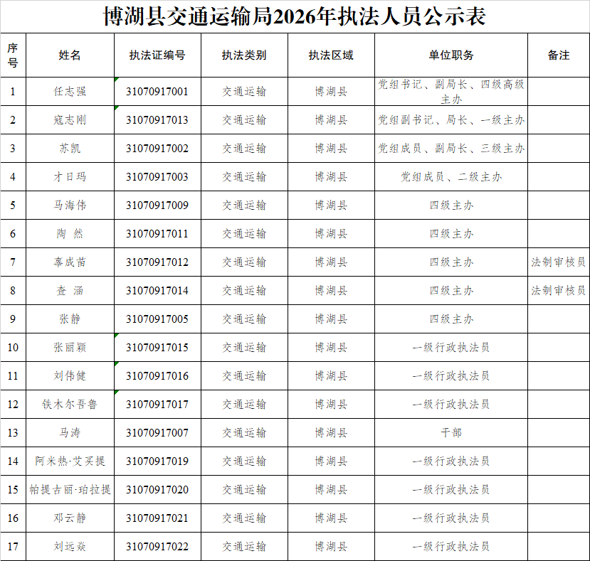 博湖县交通运输局2026年执法人员公示表
